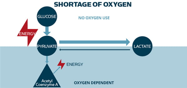 Les cellules du corps produisent de l’énergie en convertissant le glucose en pyruvate, qui est ensuite converti en Acétyl-coenzyme A, la principale source d’énergie du corps [5]. La dernière partie du procédé dépend de l’oxygène. Lorsque les niveaux d’oxygène sont insuffisants, le pyruvate est métabolisé en lactate [5].